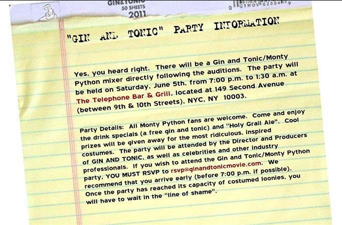 Yes, you heard right. There will be a Gin and Tonic/Monty Python mixer directly following the auditions. The party will be held on Saturday, June 5th, from 7:00 p.m. to 1:30 a.m. at The Telephone Bar & Grill, located at 149 Second Avenue (between 9th & 10th Streets), NYC, NY 10003.